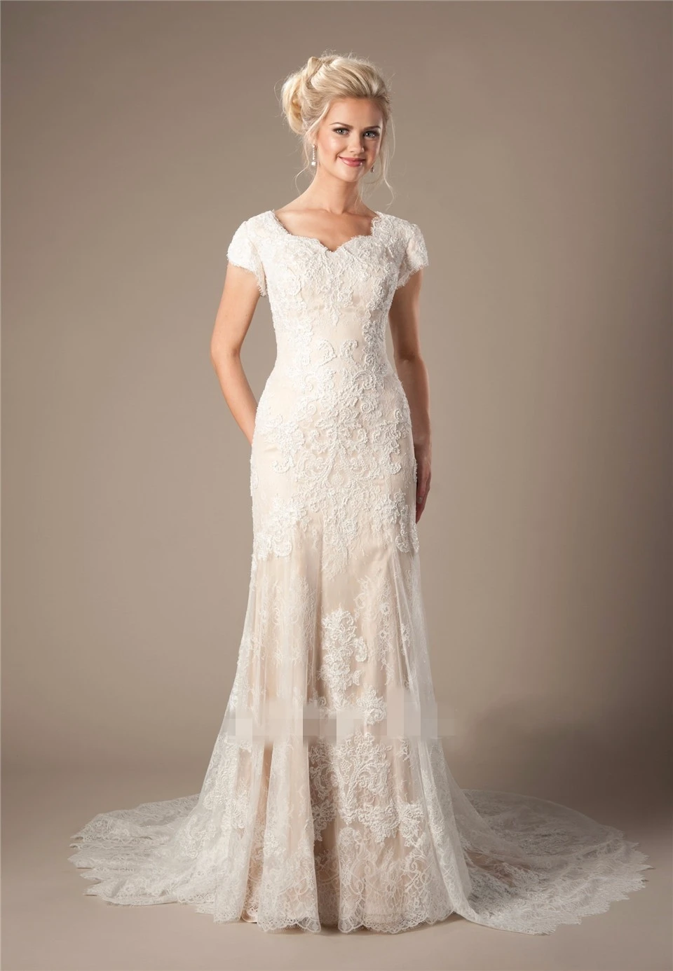 Champagner Spitze Meerjungfrau Modest Brautkleider Cap Sleeves Perlen Rustikalen Vintage Brautkleider Country Western Hochzeit Kleid Vintage Bridal Gown Bridal Gownwestern Bridal Gowns Aliexpress