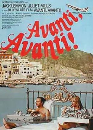 (Forward!), a daily newspaper, the central organ of the Italian United Socialist Party;. (1972) 45th Anniversary Screening Wednesday, March 29, at 7 PM at the Royal Theatre Followed by Q&A with CoStars Juliet Mills and Clive Revill Sixtime Oscar winner Billy Wilder made one of his most underrated movies, Avanti!, in 1972 The film’s stature has risen dramatically in recent years In his 1999 book, Conversations with Wilder, Oscarwinning writerdirector Cameron Crowe declared, “The prize of Wilder’s laterperiod work, Avanti!. 'Avanti', Billy Wilder's last notable film, is defined by absence Most obviously so in the case of the central couple, playing out their relationship in the shadow of the dead parents they have come to bury, an absence comically mirrored when their corpses are snatched by the disgruntled peasants on whose farm their car crashed.