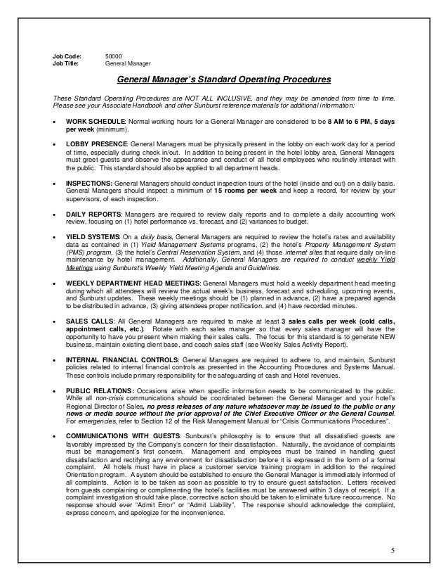 The description below are tools to achieve the core responsibility of the General Manager The General Manager is responsible for all aspects of operations at the hotel, daytoday staff management and guests He/She should be an ambassador for the brand and the hotel. The Hotel General Manager Time for a New Job Description?. GM DUTIES AND RESPONSIBILITIES Oversee the operations functions of the hotel, as per the Organizational chart Hold regular briefings and meetings with all head of departments Ensure full compliance to Hotel operating controls, SOP’s, policies, procedures and service standards Lead all key.