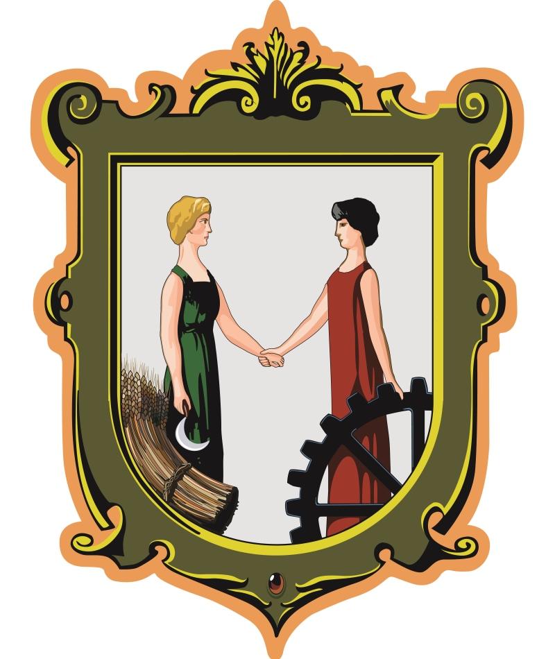 German Gablonz an der Neiße;. Palace Plus česká bižuterie a sklo;. District (Okres) Jablonec nad Nisou Official blazon V modrém štítě pod červenou hlavou se dvěma dalešickými perlami přirozené barvy navlečenými na stříbrné sklářské jehle stojí na červené patě s položenými stříbrnými sklářskými mačkářskými kleštěmi stříbrná budova mačkárny (drikety) s červenou.