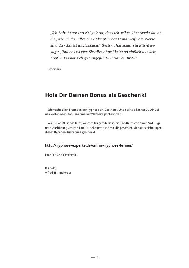 Read "Hypnotische Sprachmuster" by Alfred Himmelweiss available from Rakuten Kobo In diesem Guide der Hypnotischen Sprachmuster findest Du 50 Sprachmuster mit Beispiel und Anmerkung So, dass Du damit b. Alfred Himmelweiss spricht über unsere gemeinsame Arbeit Home / 18 / September / 27 / Alfred Himmelweiss spricht über unsere gemeinsame Arbeit 27 September 18 27 September 18 Leave a comment Post navigation Wie Ihr vielleicht wisst, komponiere und produziere ich Musik zu Hypnosen von Alfred Himmelweiss Hier spricht er über den. Für Dich öffne ich meine Schatztruhe und biete Dir alle meine Videoaufzeichnungen in einem großen Paket an Die Videos des Hypnose Masters waren bisher exklusiv und ausschließlich den Teilnehmern des Hypnose Master Seminars vorbehalten.