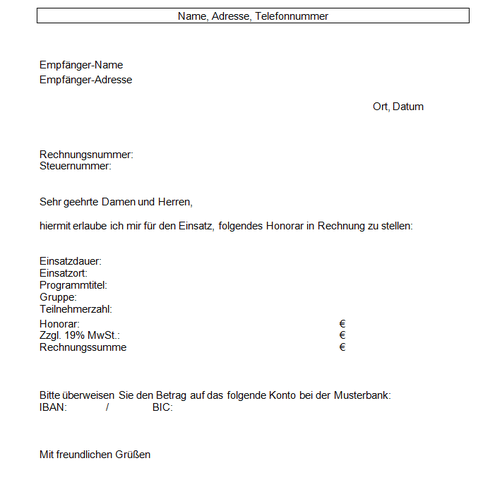 Honorarrechnung Vorlage Muster Dozenten Lehrer Freiberufler