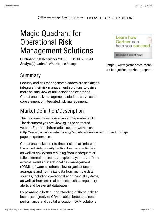 The Gartner Magic Quadrant for Software Asset Management Tools is an important aide for organizations seeking an unbiased, third party evaluation of vendors as more organizations move to single platforms for managing software assets ServiceNow provides a single platform of products on one architecture. Operations Manager 07 R2 has moved from the "challengers" quadrant to the industrysought "leaders" or "magic quadrant" for IT Event Correlation and Analysis As Gartner says for this area, 'The. Gartner Magic Quadrant for IT Risk Management Summary Security and risk management leaders experience increased demand for ITRM solutions originating from cybersecurity initiatives, board risk oversight and digital compliance obligations.